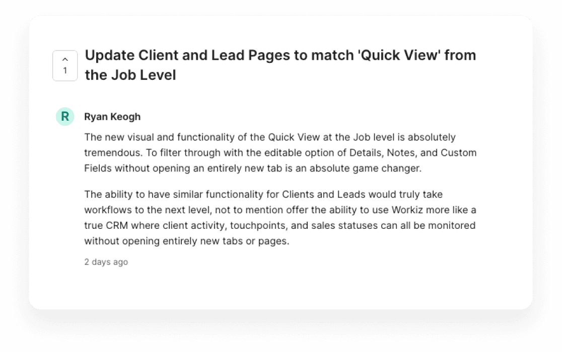 Led the redesign of Workiz’s Job Side Pane, the primary decision surface for managing jobs across the CRM. Through user surveys and behavioral insights, I simplified the interface, removed unused elements, and improved information hierarchy to enable faster, context-driven job management.